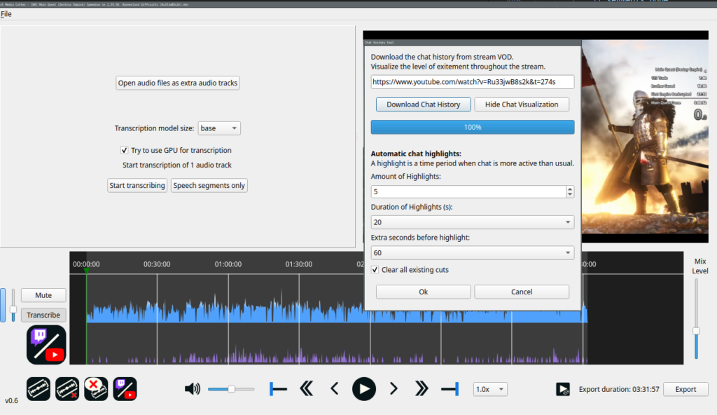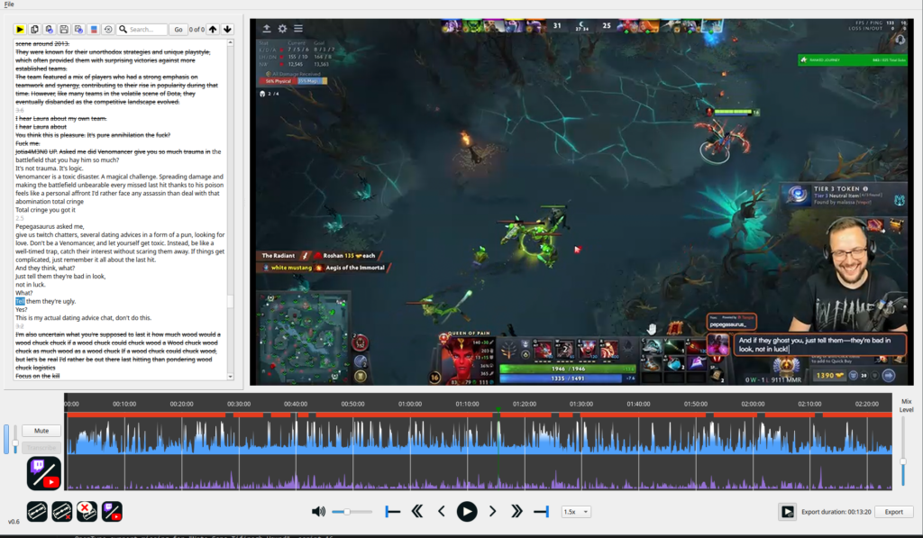 It has been little over a week since version 0.5 dropped, but I’ve cooked up a new release for you. The big new feature is the ability to download stream chat history from Twich/YouTube/Facebook VODs and to use them to guide your editing, to find highlights, etc.