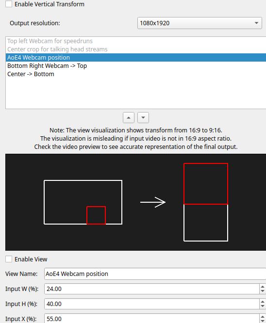 Here you see the new vertical video transform dialog, used for editing the where the relevant content is located in the input stream and where it should be placed in the output. Some sort of editor like this is necessary since every stream or other input video has their own setup.